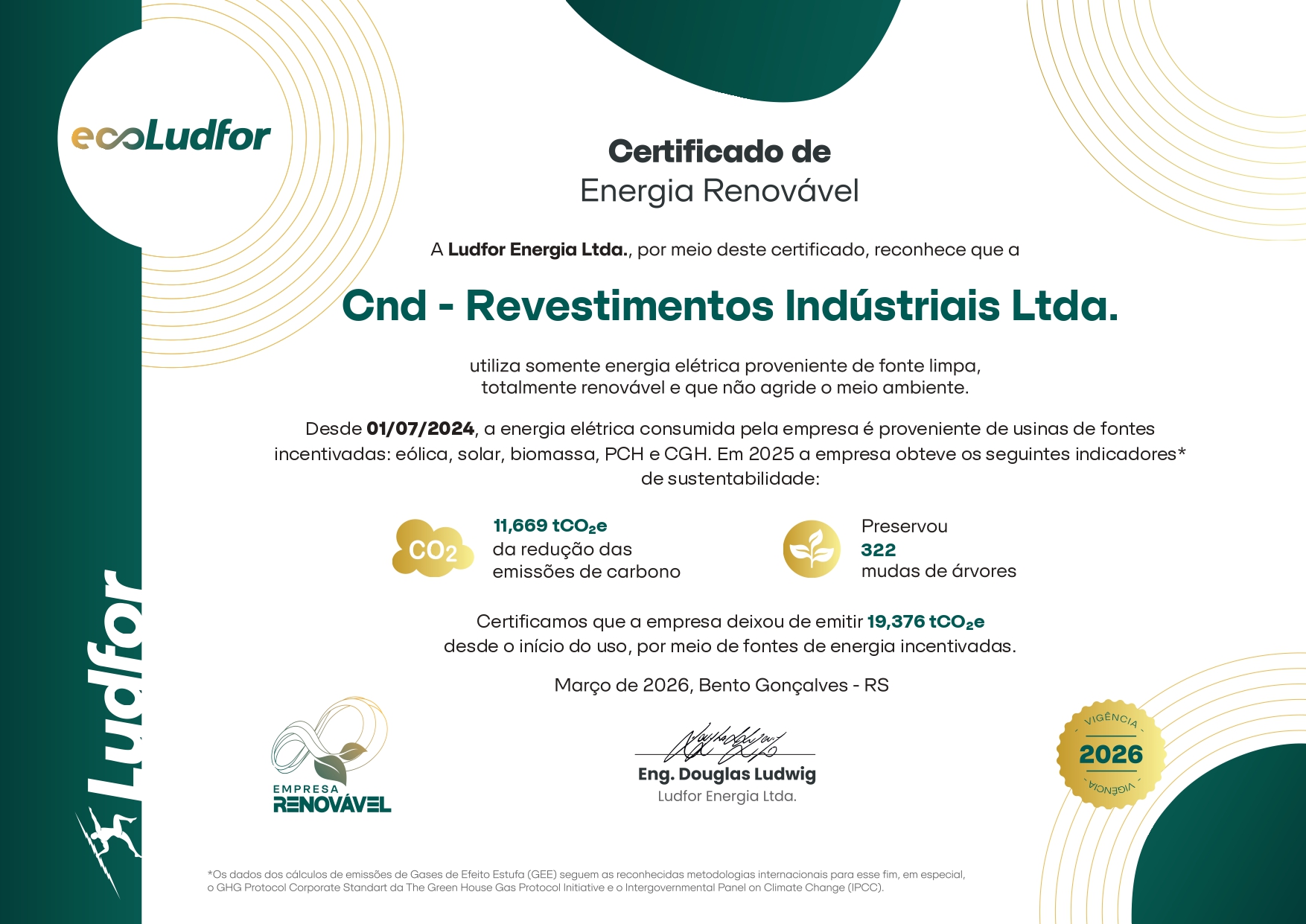 A CND Revestimentos Industriais conquistou o Certificado de Energia Renovável, emitido pela Ludfor Energia Ltda., que reconhece oficialmente o uso exclusivo de energia elétrica proveniente de fontes limpas, renováveis e ambientalmente sustentáveis em seu parque fabril.